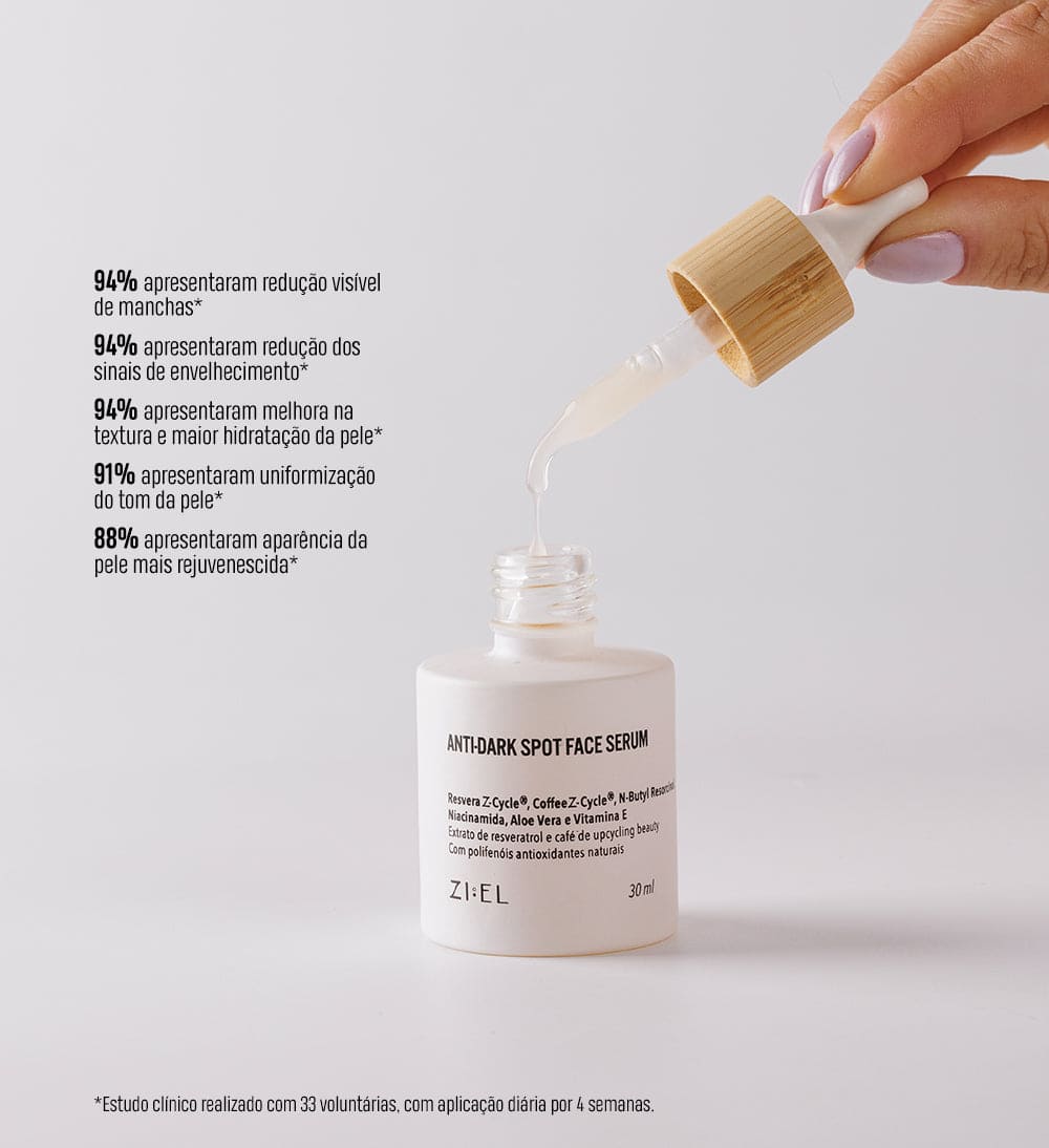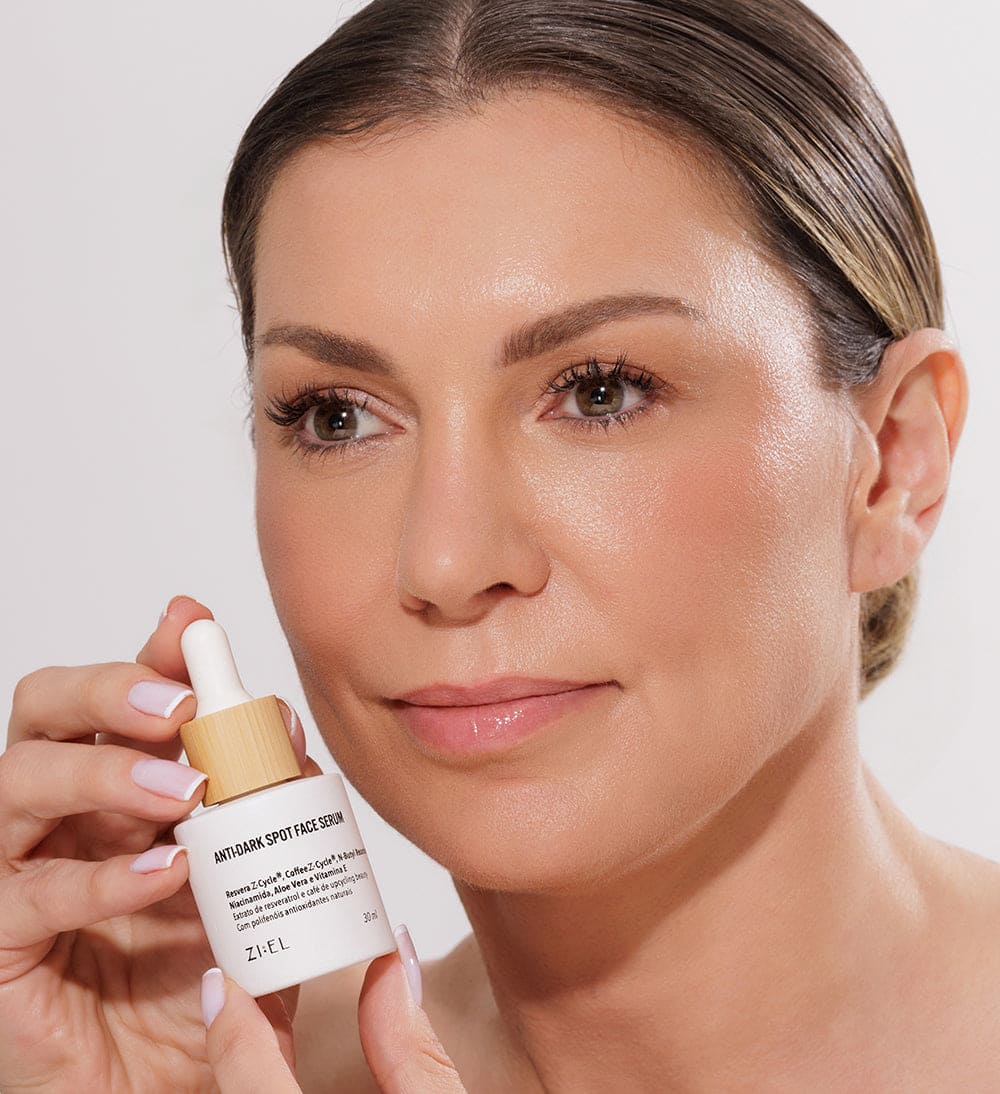 Reduz manchas, uniformiza a pele e hidrata. Fórmula vegana e limpa da Ziel.